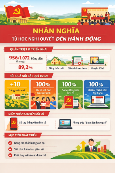 Ngay từ đầu năm 2026, trong bối cảnh cả nước tích cực triển khai Nghị quyết Đại hội đại biểu toàn quốc lần thứ XIV của Đảng, Đảng bộ xã Nhân Nghĩa đã chủ động, quyết liệt cụ thể hóa nghị quyết vào thực tiễn, tạo chuyển biến rõ nét trong công tác xây dựng Đảng, góp phần củng cố nền tảng chính trị vững chắc từ cơ sở.