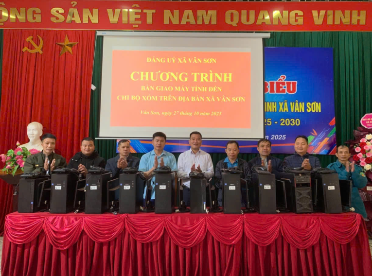 Bí thư Đảng ủy xã Vân Sơn, Nguyễn Duy Tư trao tặng 10 bộ máy tính cho các bí thư chi bộ xóm nhằm tăng cường công tác chuyển đổi số đến cơ sở