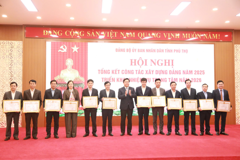 Đồng chí Trần Duy Đông, Phó Bí thư Tỉnh ủy, Bí thư Đảng ủy, Chủ tịch UBND tỉnh trao giấy khen của BTV Đảng ủy UBND tỉnh cho các tổ chức đảng HTXSNV tiêu biểu