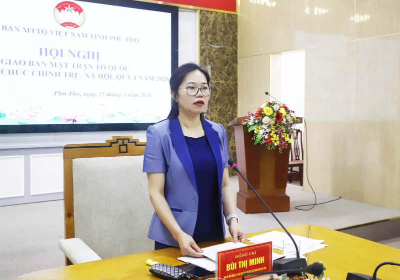 Phát biểu chỉ đạo tại hội nghị, Phó Bí thư Tỉnh ủy, Chủ tịch Ủy ban MTTQ Việt Nam tỉnh Bùi Thị Minh ghi nhận, biểu dương những kết quả đạt được cùng sự nỗ lực cố gắng của toàn hệ thống MTTQ và các tổ chức chính trị - xã hội trong triển khai thực hiện nhiệm vụ quý I/2026.