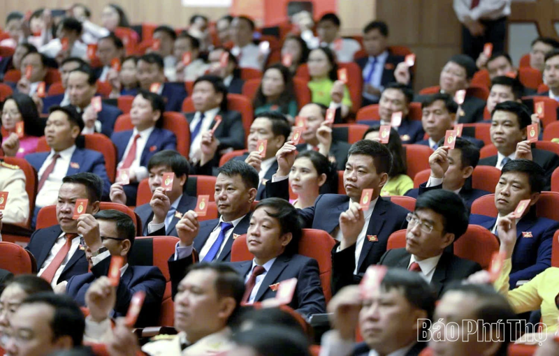 Các đại biểu biểu quyết số lượng và danh sách Đoàn Chủ tịch, Đoàn thư ký Đại hội đại biểu Đảng bộ tỉnh Phú Thọ lần thứ I, nhiệm kỳ 2025-2030 (Ảnh nguồn: Baophutho.vn)