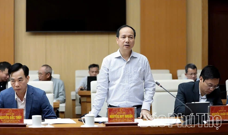 Giám đốc Sở Nông nghiệp và Môi trường Nguyễn Huy Nhuận báo cáo triển khai các biện pháp khắc phục ảnh hưởng của bão, mưa lũ đối với sản xuất nông nghiệp và tiến độ xây dựng Bảng giá đất