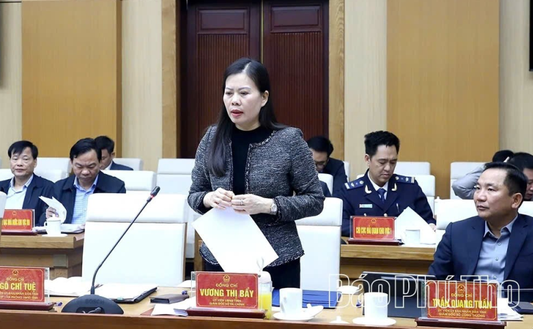 Giám đốc Sở Tài chính Vương Thị Bẩy báo cáo tình hình phát triển kinh tế - xã hội và kết quả thực hiện kế hoạch giải ngân vốn đầu tư công trên địa bàn tỉnh