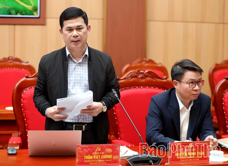 Đồng chí Trần Việt Cường - Ủy viên Ban Thường vụ Tỉnh ủy, Giám đốc Sở Nội vụ phát biểu tại hội nghị.