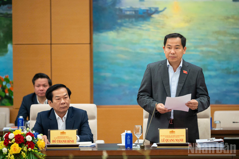 Tổng Thư ký Quốc hội, Chủ nhiệm Văn phòng Quốc hội, Chánh Văn phòng Hội đồng Bầu cử Quốc gia Lê Quang Mạnh báo cáo kết quả công tác chuẩn bị bầu cử. (Ảnh: DUY LINH)